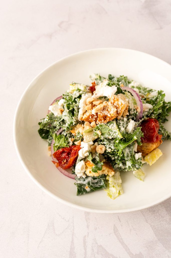 Fresh Kale, Hearts of Romaine, Goat Cheese, Pecorino Romano, Red Onion, Soleggiati Tomato, Roasted Garlic Croutons, Toasted Hazelnuts, Lemon Aioli